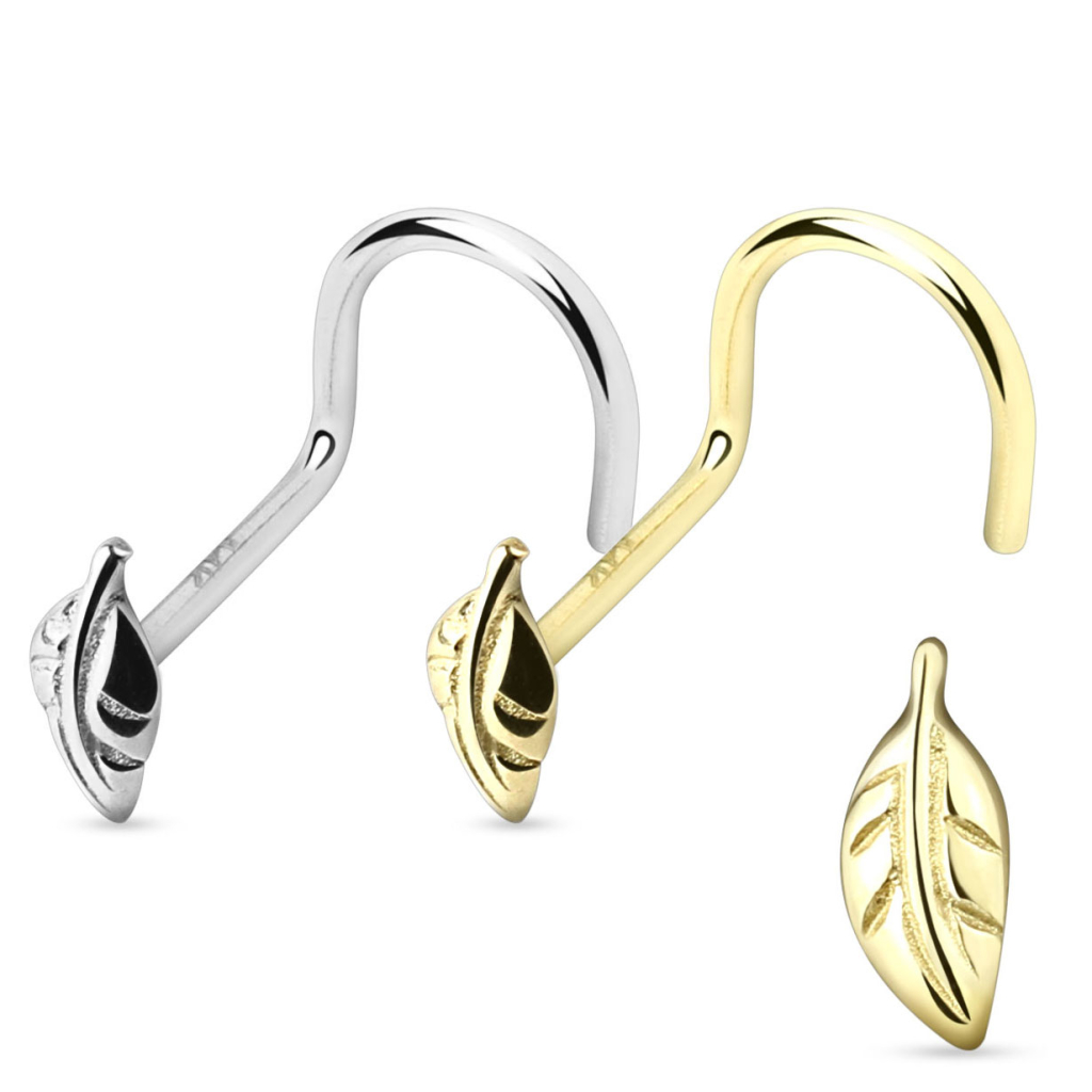 Her har du muligheten til å få fingrene i en virkelig vakker og feminin neseskrue av 14 karat gull med blad på fronten. Det lille bladet buer svakt i både stilk og fasong og imiterer dermed et ekte blad utrolig godt. Bladet av det reneste gull er 6,7 mm. høyt og 2,7 mm. bredt og er designet slik at man kan se strukturene av årene på begge sidene. Det er et ytterst naturtro design som i formen godt kan lede tankene bort på den stolte bøken med sine karakteriske lysegrønne blader.