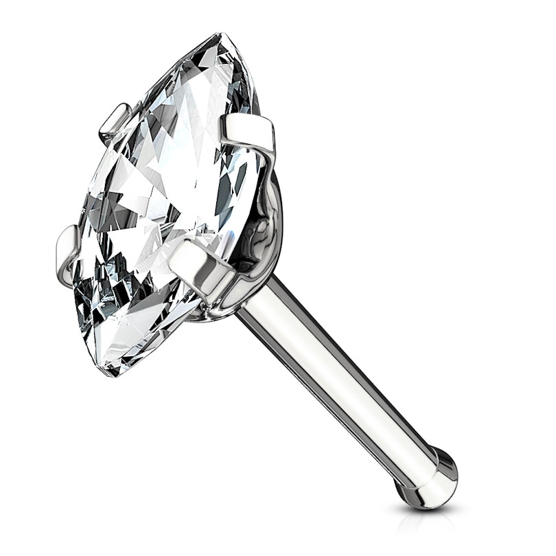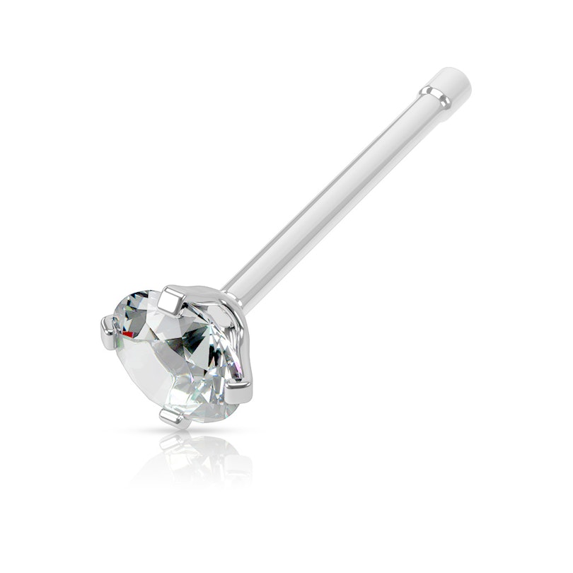 Selve smykket er laget av kirurgisk stål og måler cirka 6 mm. i lengden og 0,8 mm. i trådtykkelse. Det vil si at du kan bruke smykket uansett om du har fått satt din nesepiercing med en nål eller fått den skutt med piercingpistol. Smykket sitter fast ved hjelp av den lille kulen som sitter i enden av staven - kulen fungerer som en mothake som forhindrer at smykket faller ut i tide og utide.