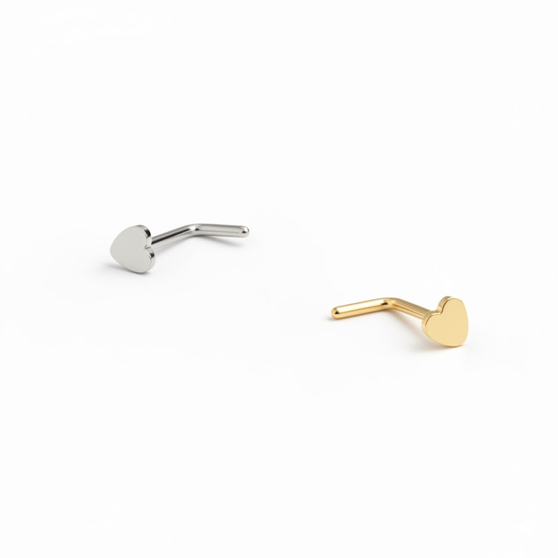Designet for nostrilpiercinger er denne hjerteformede studen diskre, men blir likevel lagt merke til. Tilgjengelig med gull- eller sølvfinish.