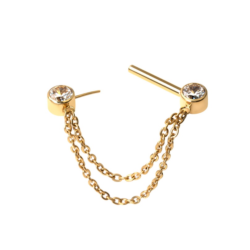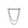 Denne nippelbarbellen er laget av titan av implantatkvalitet og har innfattede CZ-stener i kulene. Det unike smykket har også titankjeder som holder seg under brystvorten. De er koblet til kulene med en delikat loop.