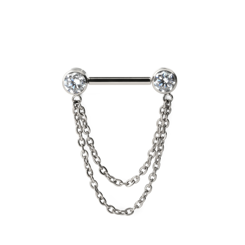 Denne nippelbarbellen er laget av titan av implantatkvalitet og har innfattede CZ-stener i kulene. Det unike smykket har også titankjeder som holder seg under brystvorten. De er koblet til kulene med en delikat loop.