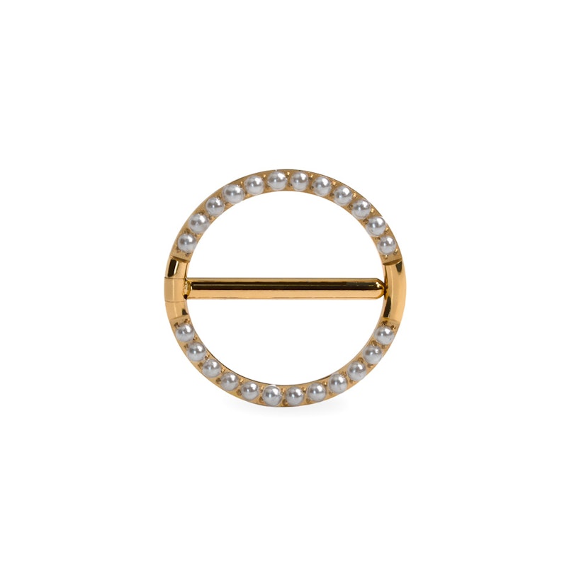 Denne nippelclickeren i titan med perler er beviset på at perler ikke bare er ment for halsbånd. En komplett sirkel i gull eller sølv med innfattede perler rammer inn piercingen med attitude.