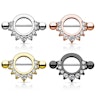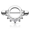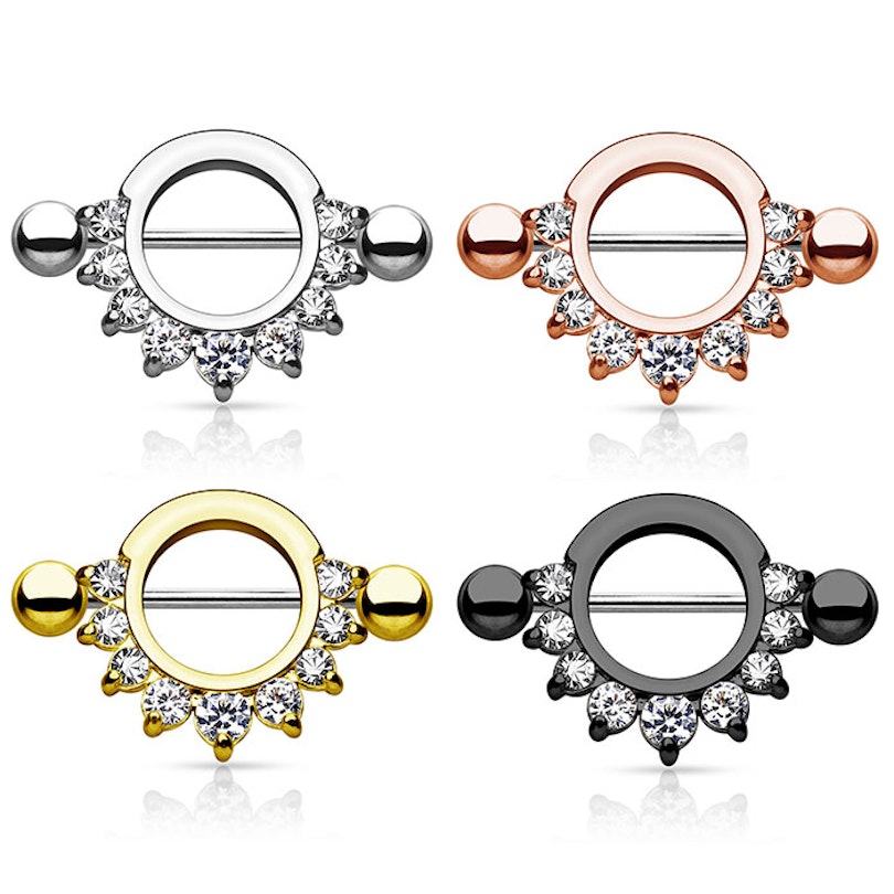 Er det tid for å skjemme bort din nipple piercing med et pirrende nytt smykke, så er dette vakre brystskjoldet kanskje akkurat det du går og leter etter. Denne nipple piercingen består av en stav som går gjennom en lukket ring, hvorav den nederste del av ringen har form som en flott stenbesatt halvmåne. Buen rommer i alt ni vakre dråpeformede stener som til sammen danner den flotte halvmånen.