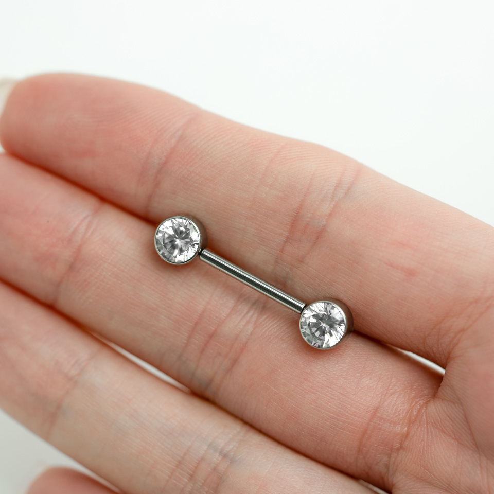 Nipplebarbell laget av titan med gjengeløs push-in med stener