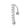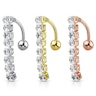 Smykket du ser på produktbildet over, består av en buet stang laget av kirurgisk stål. I bunnen sitter det som normalt ville vært toppkulen, men siden dette er en omvendt navlepiercing, plasseres dermed toppkulen nederst og ikke øverst. I kontrast sitter anhenget som vanligvis ligger i bunnen, nå øverst. Det gjør smykket ideellt for bruk hvis du er piercet i den nedre delen av navlen. Du kan imidlertid også enkelt bruke den i en "normal" navlepiercing - Da vil stenene bare stikke rett over navlen og dekke både stav, kule og navlen.