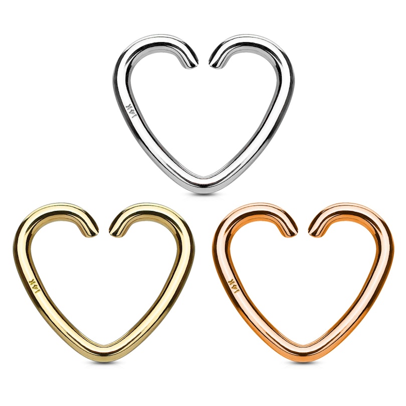 Hjertet kan kjøpes i flere forskjellige varianter, hvor du selv velger hvilken type gull smykket skal ha samt hvilken tykkelse som passer din piercing best. De indre målingene av dette hjertet har en bredde på 10mm og en høyde på 9mm. Alle variantene har samme mål bortsett fra trådtykkelsen. Smykket tar seg derfor kjempegodt ut i de fleste ørepiercinger. Her kan det f.eks. nevnes tragus, helix og daith som dette smykket egner seg best til.