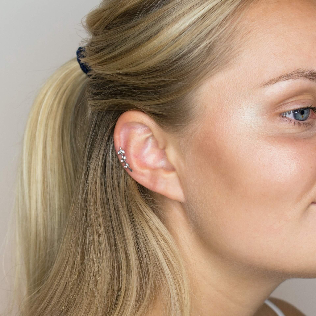 Ørepiercing med blader av sten