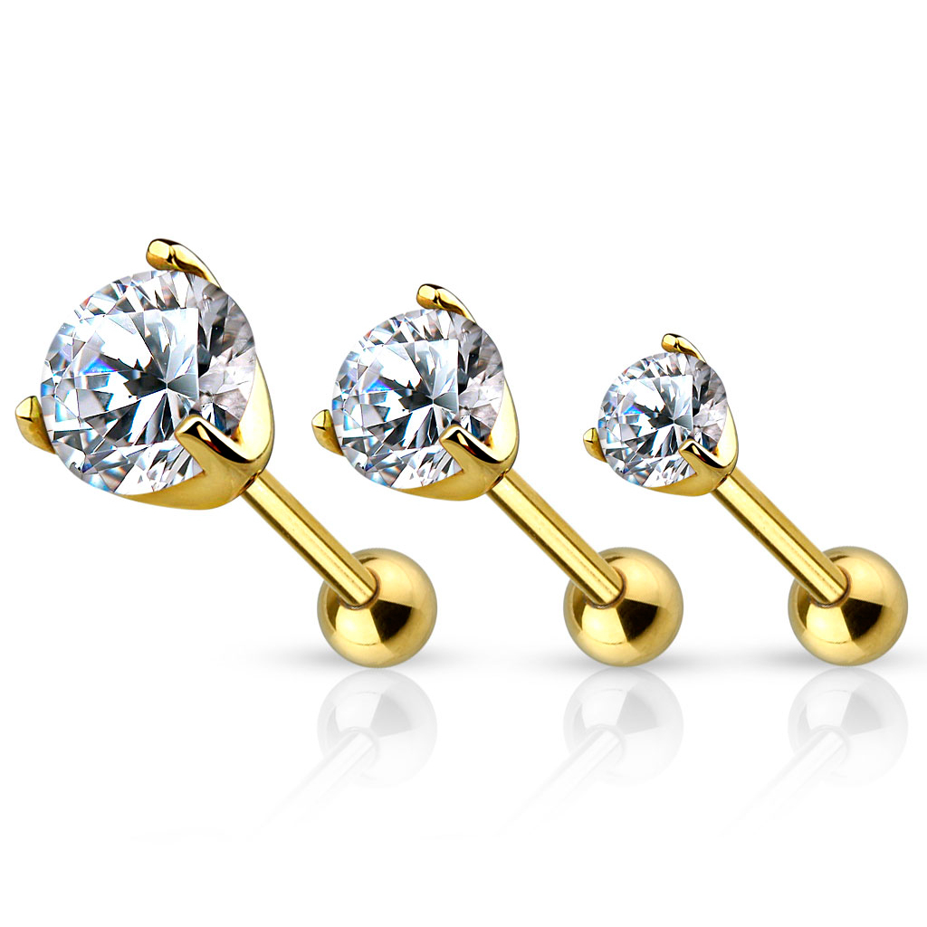 Her kan du få den lekreste luksus i form av dette tripp, trapp, tresko ørepiercingsettet av ekte gull. De tre lekre ørepiercingene har alle en trådtykkelse på 1,2 mm. og passer derfor perfekt til piercinger som er laget med nål. Hver ørepiercing er utstyrt med en skinnende vakker klar sten, men i tre forskjellige størrelser. Du får altså både en 2 mm, en 3 mm. og en 4 mm. stor sten i dette settet.