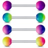 På bildet ovenfor ser du en piercingstav som er laget av kirurgisk stål med to påsatte kuler i hver ende. Kulene på staven er blitt belagt med gummi og de har begge skiftende fargenyanser. Det er mulig å velge mellom fargenyansene på kulene, alt etter hva du foretrekker - om det for eksempel er blå/grønn eller rosa/gul. De forskjellige modellene har samme trådtykkelse på 1,6 mm., samt en lengde på 16 mm. Begge kulene kan dog skrues av, så du kan alltid kjøpe en lengre eller kortere stav, hvis du ønsker dette.