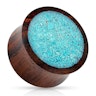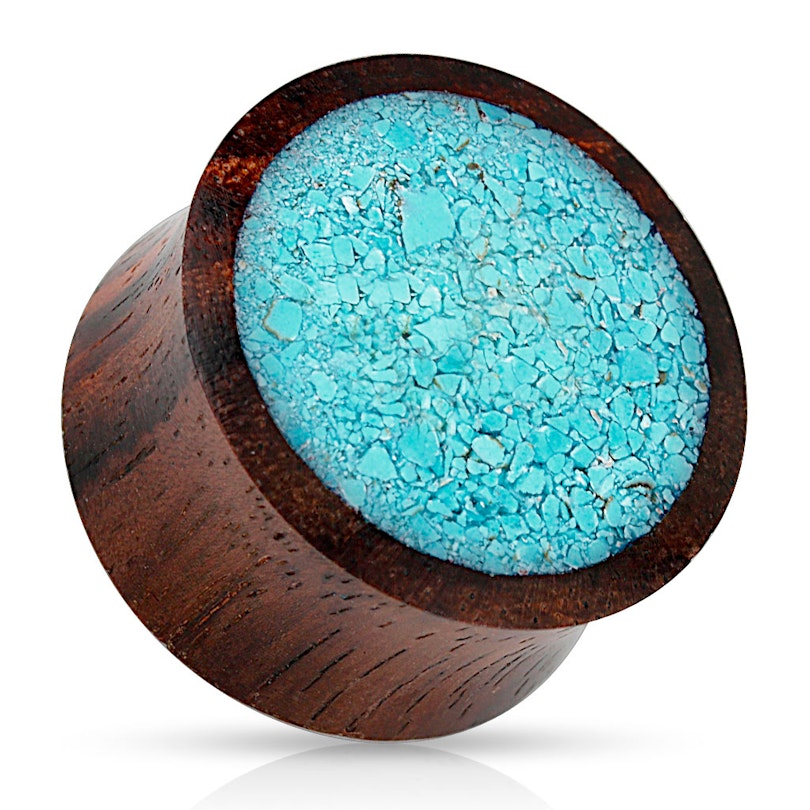 Her er pluggen dessuten dekorert med en helt unik front som består av knust turkis sten. De mange små knuste stykkene med sten passer sammen som brikker i et puslespill, hvoretter overflaten er blitt polert så den er helt glatt. Det er faktisk et helt lite kunstverk i seg selv og en helt ny og kreativ måte å bære sten i sine smykker.