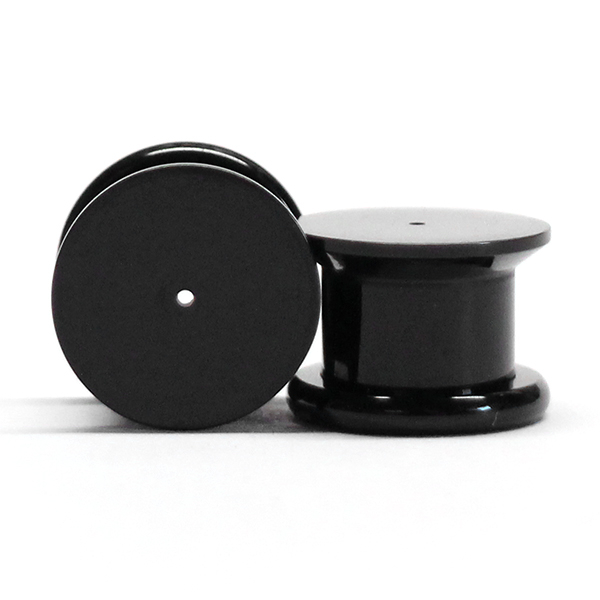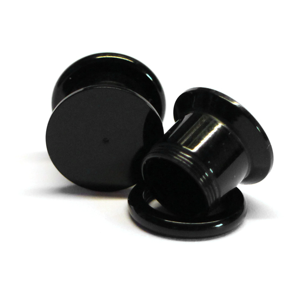 Pluggen er laget av sort akryl og har gjenger på baksiden, så den er enkel å ta inn og ut av øret. På forsiden er den helt flat og har et lite hull i midten på 0.8 mm. som passer til helt vanlige øreringer, som dem man bruker når man kun har alminnelige hull i ørerne.