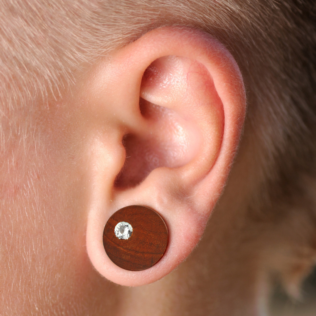 Denne pluggen som fås i seks forskjellige størrelser, er pussett opp så den har en helt glatt overflate samt myke avrundede kanter. Pluggen er flat og lik på begge sidene, på nær den ene klare lille stenen som er satt inn som pynt på forsiden. Stenen er nedsenket i treet så den nesten er plan med pluggens overflate og er fasettskåret som en diamant så den skinner og glimter fra alle vinkler når lyset treffer den. De flate sidene får dessuten pluggen til å sitte pent plan med øreflippen.