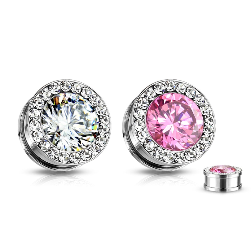Pluggen er laget av kirurgisk stål og har på baksiden en gjenge for lettere å kunne få smykket i øret. På fronten er det i sentrum den store stenen som du selv velger fargen på. Rundt stenen sitter det i kanten mange små klare stener. Jo større diameter du velger, jo flere stener sitter rundt kanten.