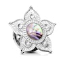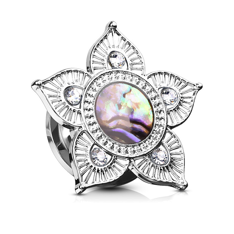 Du fikk nok et glimt av den flotte pluggen på bildet over siden du scrollet ned for å lese denne teksten. Denne pluggen er utstyrt med en messingfront som er formet som en lotusblomst. Hvert enkelt av blomstens blader har fått noen små fordypninger inn i mellom, pluss at det sitter en klar sten i bunnen av hvert blad - dette gjelder dog ikke for størrelsene 3 mm., 4 mm., 5 mm. og 6 mm. I midten av blomsten sitter det en stor abalone. En abalone er et slags muslingskjell, som har en perlemorsskinnende farge på innsiden av skallen. Derfor brukes abalonen ofte i forbinnelse med blant annet smykkefremstilling. Siden abalone er et naturmateriale, er det også verdt å nevne at ingen to skjell er like. Fronten vil derfor være forskjellig på alle smykker.