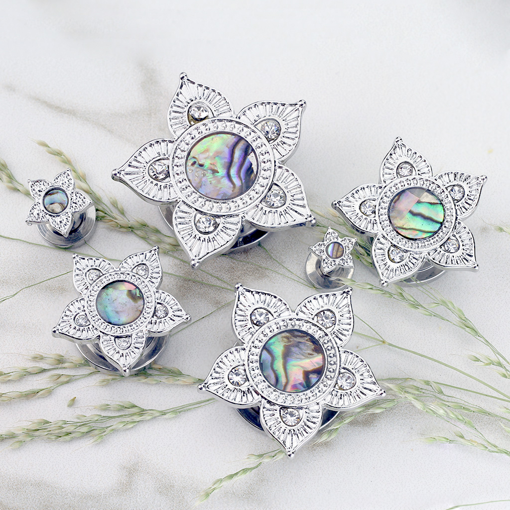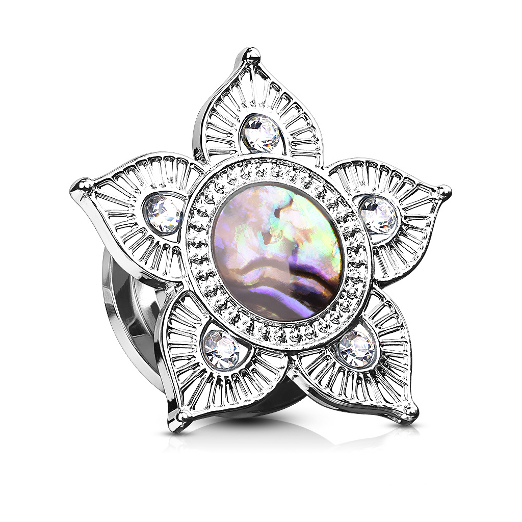 Du fikk nok et glimt av den flotte pluggen på bildet over siden du scrollet ned for å lese denne teksten. Denne pluggen er utstyrt med en messingfront som er formet som en lotusblomst. Hvert enkelt av blomstens blader har fått noen små fordypninger inn i mellom, pluss at det sitter en klar sten i bunnen av hvert blad - dette gjelder dog ikke for størrelsene 3 mm., 4 mm., 5 mm. og 6 mm. I midten av blomsten sitter det en stor abalone. En abalone er et slags muslingskjell, som har en perlemorsskinnende farge på innsiden av skallen. Derfor brukes abalonen ofte i forbinnelse med blant annet smykkefremstilling. Siden abalone er et naturmateriale, er det også verdt å nevne at ingen to skjell er like. Fronten vil derfor være forskjellig på alle smykker.