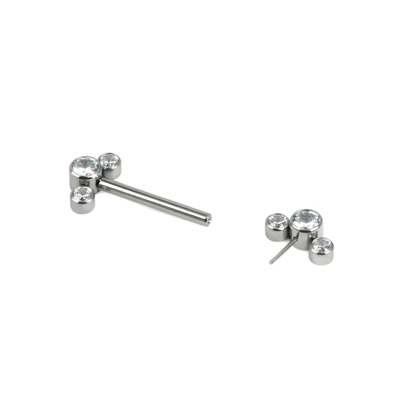 Smykket er enkelt i både design og funksjonalitet i den forstand at den ikke har noen gjenge. Måten du bruker smykkene på er ganske enkelt. Du trekker den ene enden med de tre små stenene ut av enden av stangen. Deretter setter du smykkene inn og skyver enden inn igjen. Enden festes ved hjelp av den lille staven som sitter spent inne i staven. Det kan høres ut som om det ikke er veldig stramt, men bekymre deg ikke. Den er godt festet og faller ikke bare ut av seg selv. Og skulle det etter hvert bli lettere å ta ut, kan du ved å stikke den halvveis inn i stangen, gi den en liten bøyning, slik at det blir en krumning på staven, noe som gjør at det blir mer spenning inne i stangen. På den måten kan du selv regulere alt slik at den blir mer holdbar.