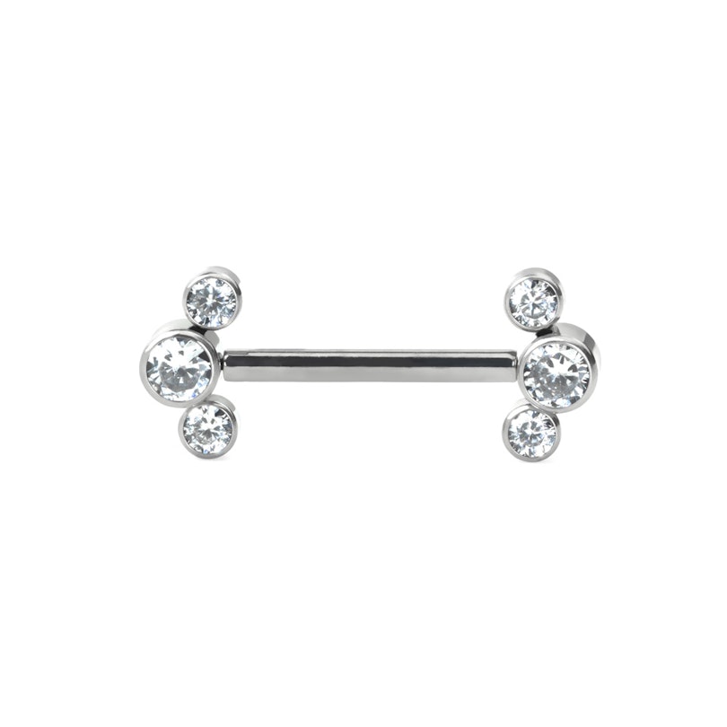 Smykket er laget av titan, som er et av det beste materialet du kan bruke til brystene dine. Stenene som sitter i hver ende er kubiske zirkoniumstener, som er festet i metallet.Den største stenen har et mål p 3.9 mm og de som er mindre har et mål på 2.9mm. Det finnes også et variert utvalg av farger på stenene å velge mellom.
