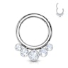 Denne ringen er laget av titan, et av de beste materialene du kan tilby din piercing. Dette er også grunnen til at den brukes til innledende piercingsmykker i nye piercinger. Ringen har en måler eller tykkelse på 16g (1,2 mm) og er tilgjengelig i diametrene 5/16" (8 mm) og 3/8" (10 mm). Uansett hvilken diameter du velger, vil ringen ha fem steiner nederst. Steinen i midten er størst og steinene blir mindre mot endene, akkurat som i en buet klynge