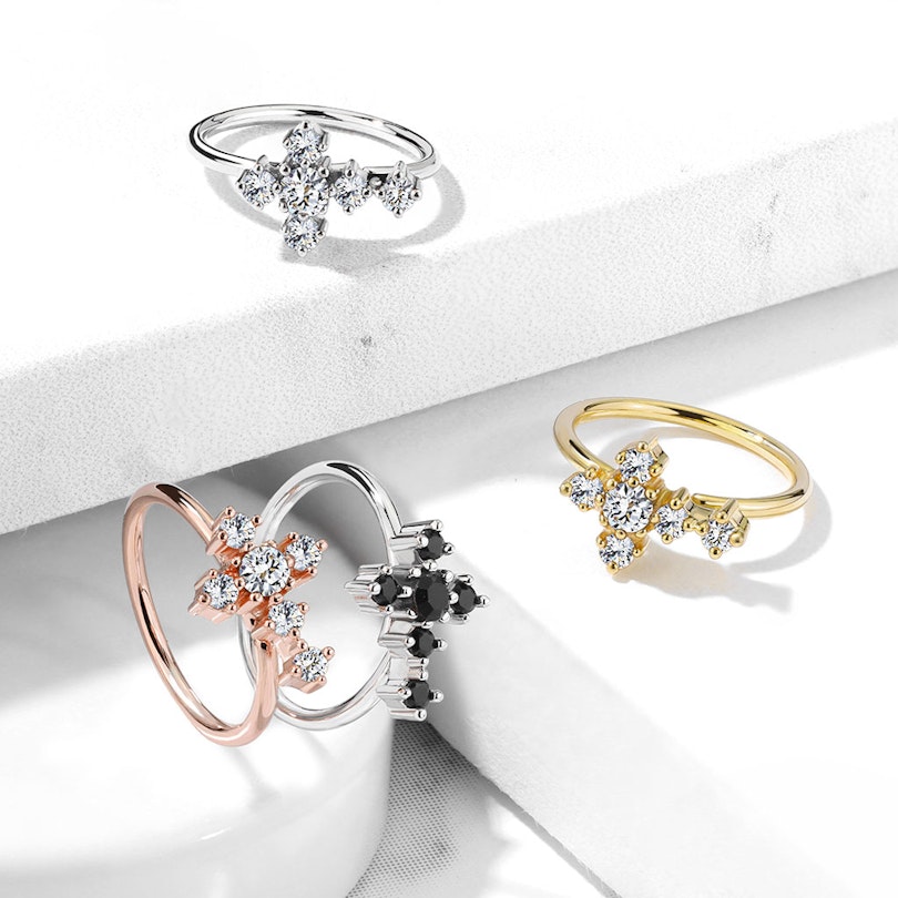 Smykket er laget av messing og måler 0.8 mm. i trådtykkelse, samt 8 mm. i diameter. Den er belagt med Platinum hvis du velger den blanke utgaven, eller 14 karat gull hvis du velger en av de to gull-modellene. Som du nok allerede har lagt merke til, så sitter det også et flott kors på fronten av smykket. Dette korset er besatt med seks små stener - disse stenene kan du velge fargen på. Du kan blant annet få ringen med klare stener på korset, eller med sorte stener.