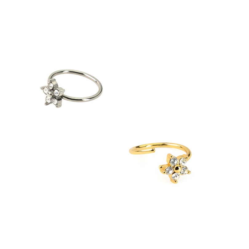 Denne delikate kirurgiske stålringen har en delikat blomst som består av fem edelstensblader rundt en sentral perle. Tilgjengelig i et utvalg av gull- eller sølvfinish, er dette stykket laget av kirurgisk stål, noe som gjør det sterkt, holdbart motstandsdyktig mot anløping. Med en tynn tråd (0,8 mm / 20g) er denne ringen ideell for nesepiercinger, men kan også brukes i helix eller andre ørepiercinger. Bare vri forsiktig for å åpne, tre den inn i piercingen og vri igjen for å feste den på plass.