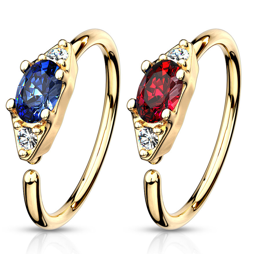 På fronten av ringen sitter det en liten oval plate som er laget av messing. Denne platen er også belagt med 14 karat gull, så den matcher resten av ringen den sitter på. Ovenpå platen sitter det tre stener, to av dem er små runde og klare stener. I midten av de to stenene sitter det en større oval sten som er farget. Hvilken farge den ovale stenen skal ha kan du selv velge - ta en titt ovenfor for å se hvilke farger du kan velge mellom før du legger den i handlekurven.