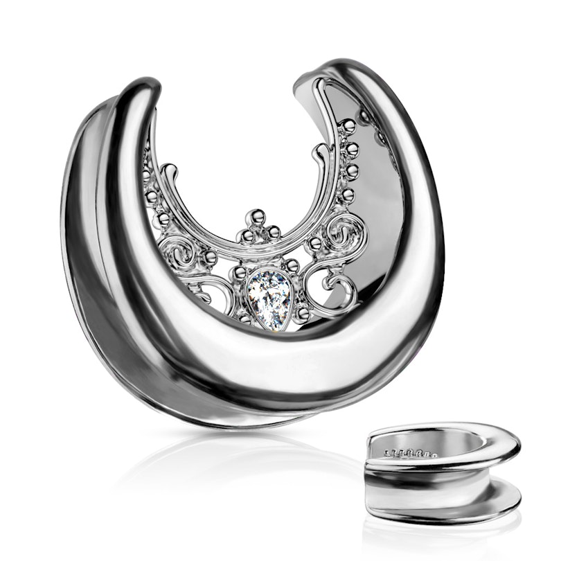 Denne saddlespreaderen ligner på den veldig enkle salesprederen vår, bortsett fra de fine vendene inni selve smykkene. Vendingene går under begrepet "filigran", som består av små vendinger blandet med små kuler. Det er ikke noe bestemt motiv å få øye på i designet, men i helhetsuttrykket ser det ut som et tett brodert mønster. Midt i mønsteret sitter det en liten klar dråpeformet sten som er selve kronen over verket.
