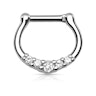 En flott og feminin septumclicker av ren kirurgisks stål, som er utstyrt med fem helt enkle men bedårende stener. Stenen som sitter i midten er litt større enn de fire andre stenene, noe som godt kan gi det inntrykket at ringen er lett dråpeformet. Det er den store stenens plassering som gir denne septumpiercingen den ekstra lille tvisten i designet.