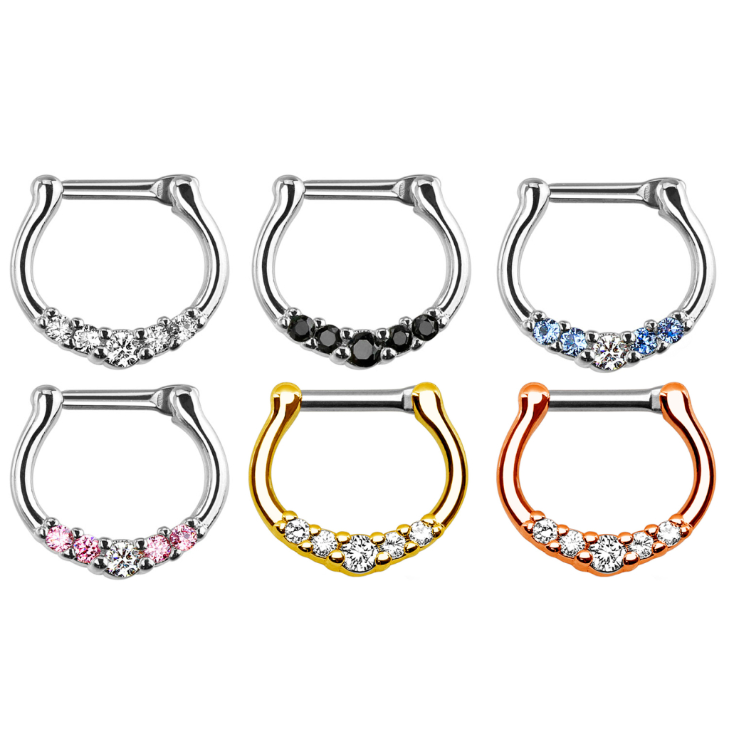 En flott og feminin septumclicker av ren kirurgisks stål, som er utstyrt med fem helt enkle men bedårende stener. Stenen som sitter i midten er litt større enn de fire andre stenene, noe som godt kan gi det inntrykket at ringen er lett dråpeformet. Det er den store stenens plassering som gir denne septumpiercingen den ekstra lille tvisten i designet.
