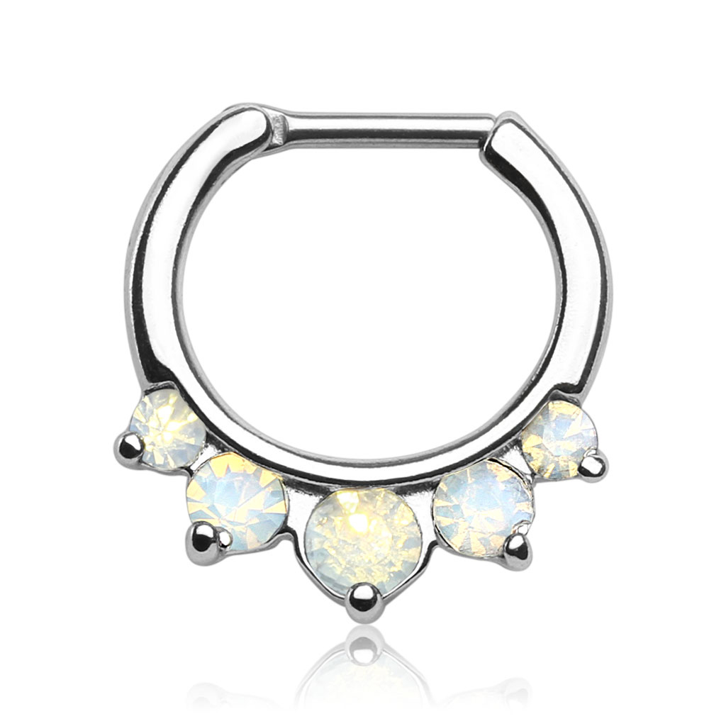 Du kan velge mellom klare, rosa eller turkisgrønne opalite stener i din nye septumpiercing. Alle tre fargene er like flotte på hver sin måte, så det er bare et spørsmål om personlig smak og behag.