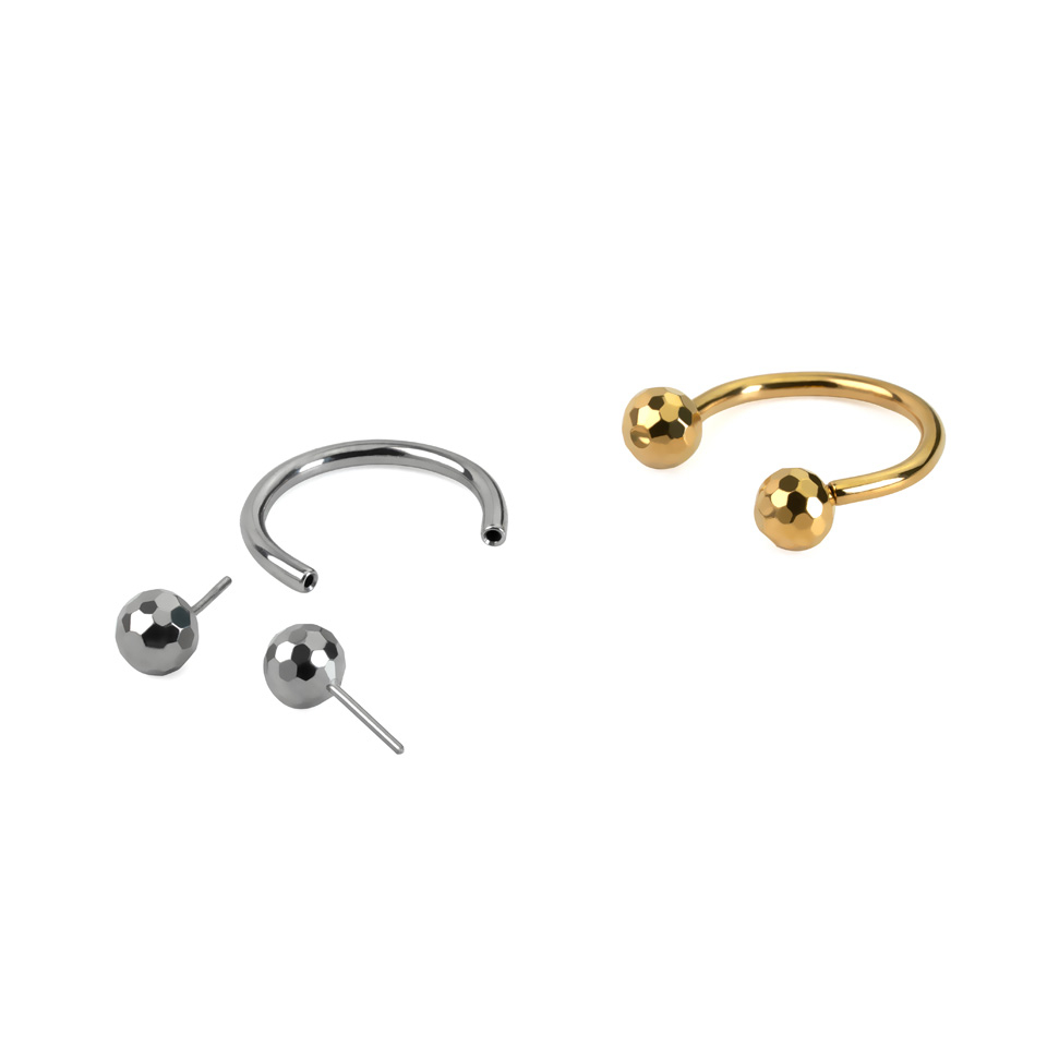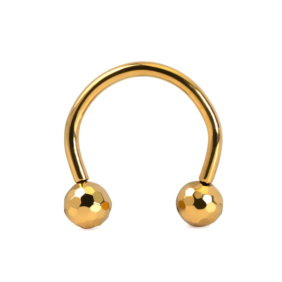 Denne hesteskoen i titan er uten gjenger, noe som betyr at kulene festes med små stifter som enkelt presses inn i hesteskoen når de festet i piercingen din. Kulene har en stilig teksturert disko-utseende med sine fasettslipte flater. Smykket passer fint til ulike piercinger, inkludert øyenbryn, øre og septum, og er tilgjengelig i gull- eller med sølvfinish.