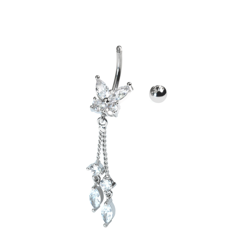 Denne glitrende navlepiercingen prydes av en vakker sommerfugl nederst på kulen, med flere skinnende stener i anhengene som henger fra sommerfuglen i delikate kjeder.