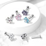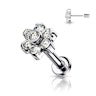 Smykkene er laget av titan, som er materialet også pierceren din bruker når du blir piercet. Du kan derfor trygt bruke dette smykke innledningsvis eller som et førstegangssmykke. Det er jo alltid litt mer spennende å bruke et smykke som er dekorert i stedet for en enkel kule uten stener. Toppen av labreten består av syv små stener som sammen danner en vakker liten blomst med seks kronblader og en sten på midten, og du kan selv velge fargen på stenene. Det er montert en liten stift på baksiden as blomsten som fungerer som en lås på smykket. Du kan ganske enkelt trekke stiften ut av staven, og presse stiften tilbake inn i staven igjen. Stiften er spennet inne i staven og blir løsere og løsere etter hvert som du bruker den gjentatte ganger. Men bekymre deg ikke! Du kan gjøre låsen sterk igjen ved å sette stiften halvveis inn i staven, og bruke åpningshullets kant til bøye stiften litt. Det gjør at spenningen i staven blir strammere igjen. Blomstens mål er er ca 5 mm. i diameter og staven er 1,2 mm og 8 mm. lang