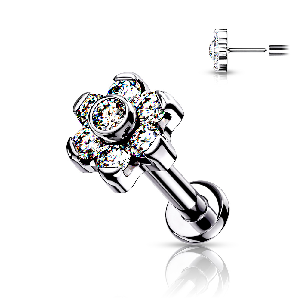 Smykkene er laget av titan, som er materialet også pierceren din bruker når du blir piercet. Du kan derfor trygt bruke dette smykke innledningsvis eller som et førstegangssmykke. Det er jo alltid litt mer spennende å bruke et smykke som er dekorert i stedet for en enkel kule uten stener. Toppen av labreten består av syv små stener som sammen danner en vakker liten blomst med seks kronblader og en sten på midten, og du kan selv velge fargen på stenene. Det er montert en liten stift på baksiden as blomsten som fungerer som en lås på smykket. Du kan ganske enkelt trekke stiften ut av staven, og presse stiften tilbake inn i staven igjen. Stiften er spennet inne i staven og blir løsere og løsere etter hvert som du bruker den gjentatte ganger. Men bekymre deg ikke! Du kan gjøre låsen sterk igjen ved å sette stiften halvveis inn i staven, og bruke åpningshullets kant til bøye stiften litt. Det gjør at spenningen i staven blir strammere igjen. Blomstens mål er er ca 5 mm. i diameter og staven er 1,2 mm og 8 mm. lang