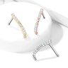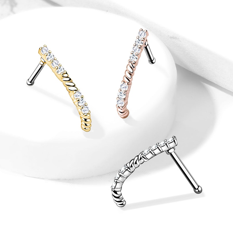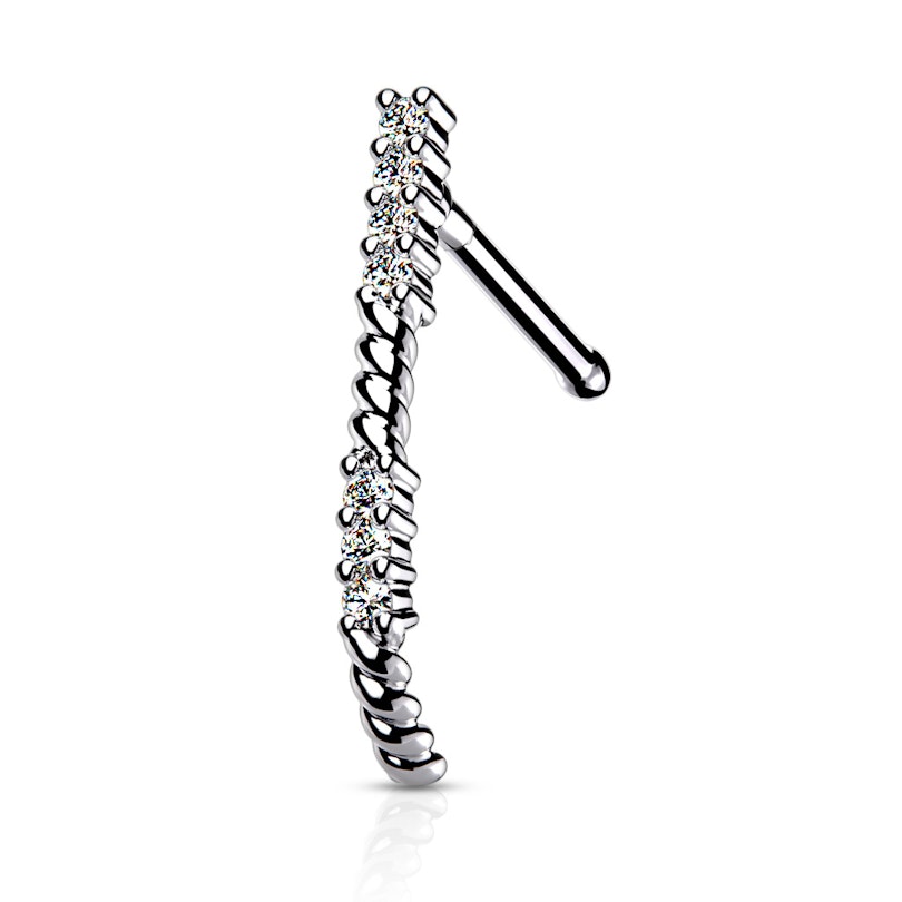 Denne skatten er både unik og elegant. Med stenene som kryper seg oppover nesen gir denne en statement. Den totale lengden på denne unike crawleren designet som et ben er 13 mm. Nesesmykket er tilgjengelig i 3 forskjellige farger: gull, rosegull og sølv. Smykket har en standardstørrelse for et nesebor: en trådtykkelse på 0,8 mm og en lengde på 6 mm. Et veldig spennende smykke som er et must-have i nesesmykkekolleksjon.