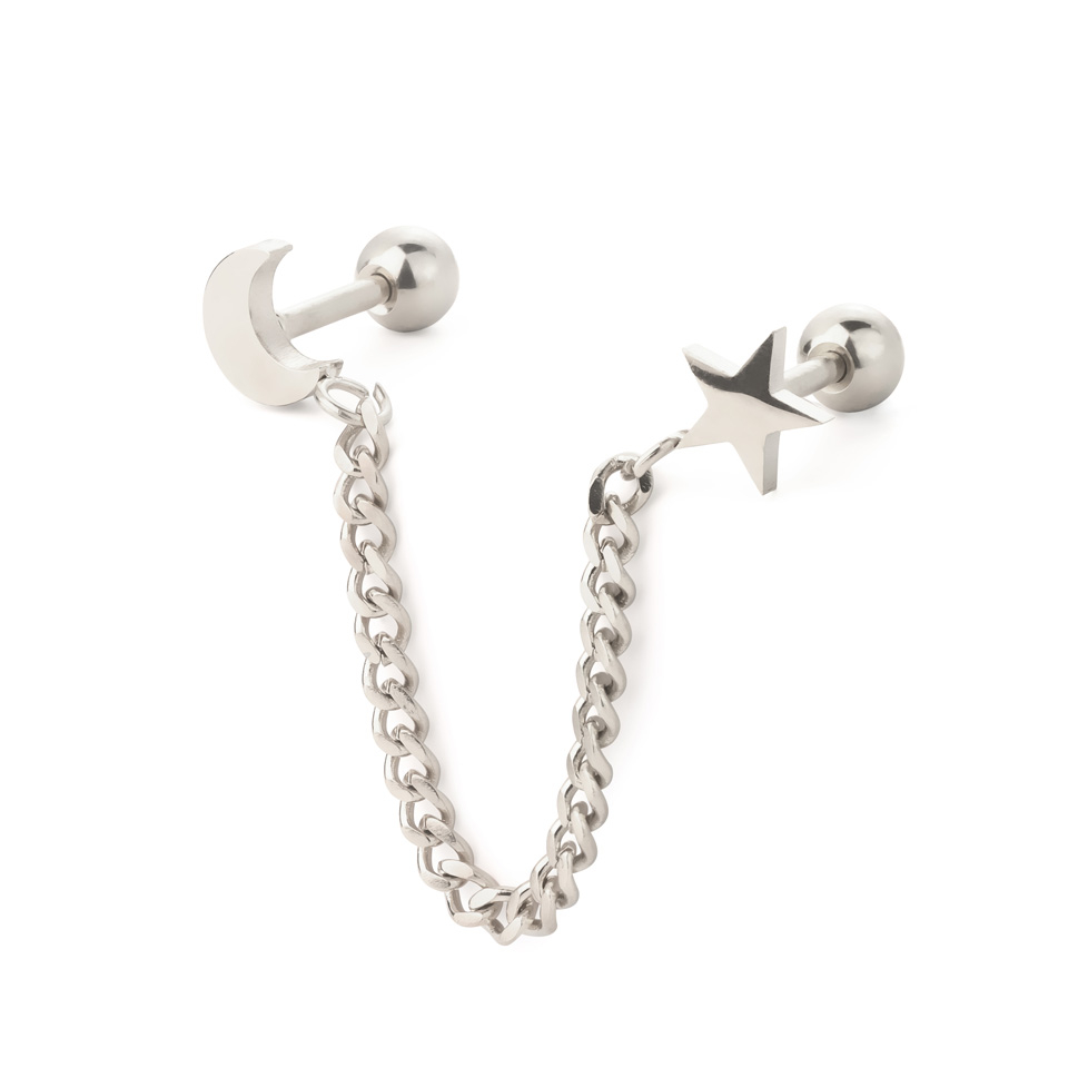 Hvis du er heldig nok til å ha to ørepiercinger, kan dette smykket være noe for deg. Ikke alle piercinger egner seg å bruke pga a barbellens utforming. Men hvis du for eksempel har en piercing i øreflippen, og en i øret, kan du fint bruke den. Lengden på kjedet er ca 4 cm.