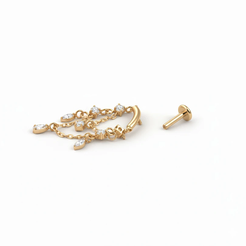 Denne titanlabreten med chandelier-anheng er skapt for bevegelse. De små dråpestenene som henger fra labretet gir smykket en dynamikk som fort blir lagt merke, og gir noe av det litt ekstra til looken uten å dominere hele looken. Smykket er et perfekt alternativ når du vil ha noe litt annerledes enn hverdagsmykkene dine. Kommer i gull eller sølvfarge.