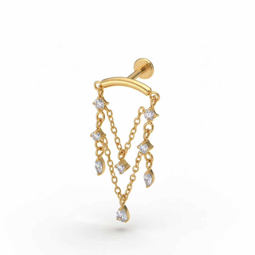 Denne titanlabreten med chandelier-anheng er skapt for bevegelse. De små dråpestenene som henger fra labretet gir smykket en dynamikk som fort blir lagt merke, og gir noe av det litt ekstra til looken uten å dominere hele looken. Smykket er et perfekt alternativ når du vil ha noe litt annerledes enn hverdagsmykkene dine. Kommer i gull eller sølvfarge.