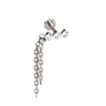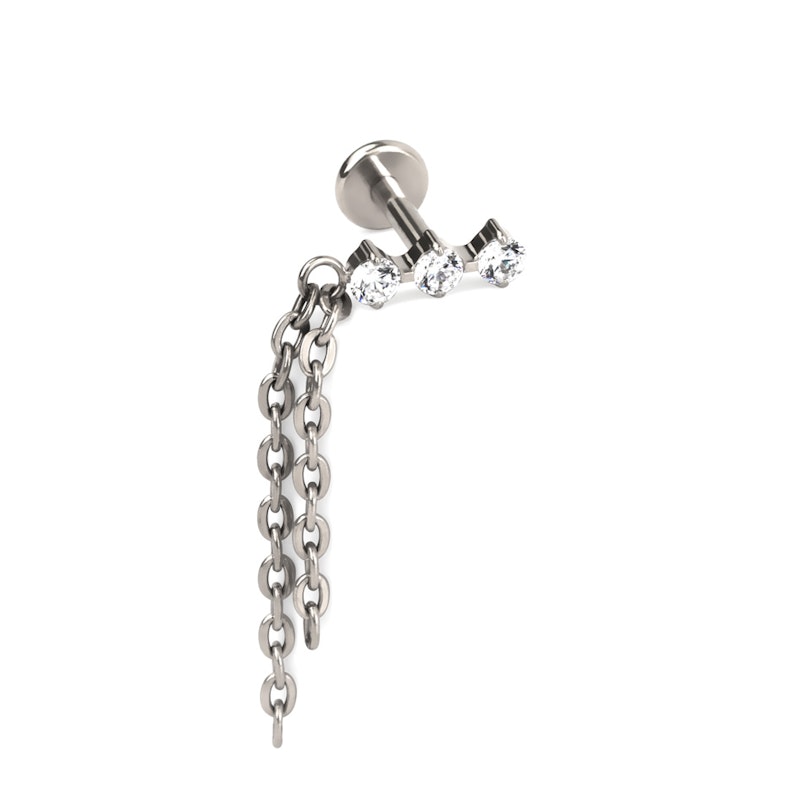Den elegante labreten har en rekke med tre innfattede zirconiasteiner, med to anheng som er festet ved hjelp av en liten anhengsring i den ene enden. Kjedene varierer i lengde og skaper en stilig asymmetrisk effekt. Den lengste kjeden måler 19 mm. Dette smykket kan bæres horisontalt i øreflippen eller vertikalt, eller i en vinkel i andre ørepiercinger. Style smykket etter eget ønske for å oppnå din unike look.