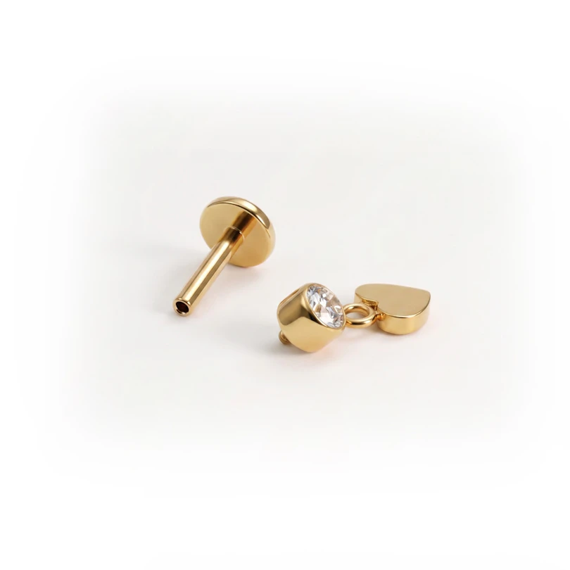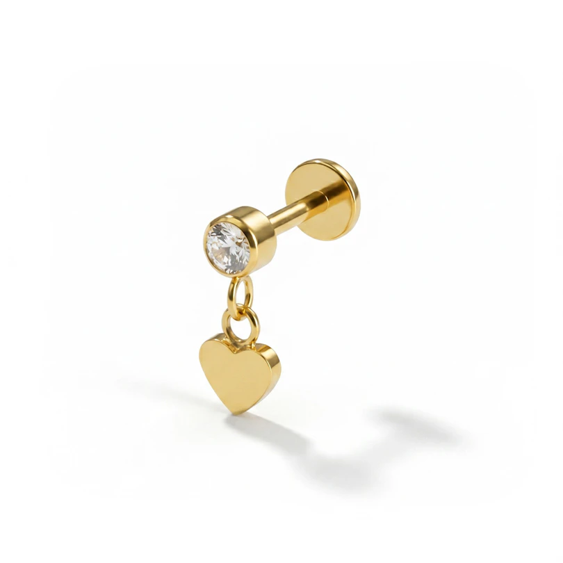 Denne titanlabreten med hjerteanheng virker enkel ved første øyekast, men så legger den til en liten detalj som forandrer alt. På toppen sitter en sten i bezelfatning og under dingler et søtt hjerteformet anheng. Dette er et smykke som passer godt både alene og sammen med andre piercingsmykker. Finnes i gull- og sølvtone.