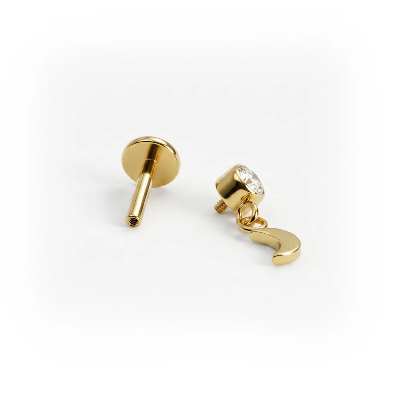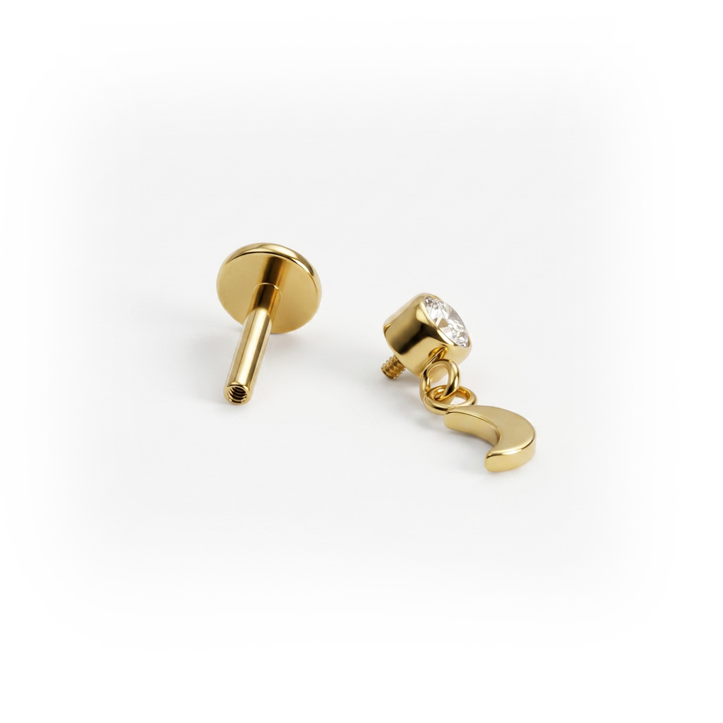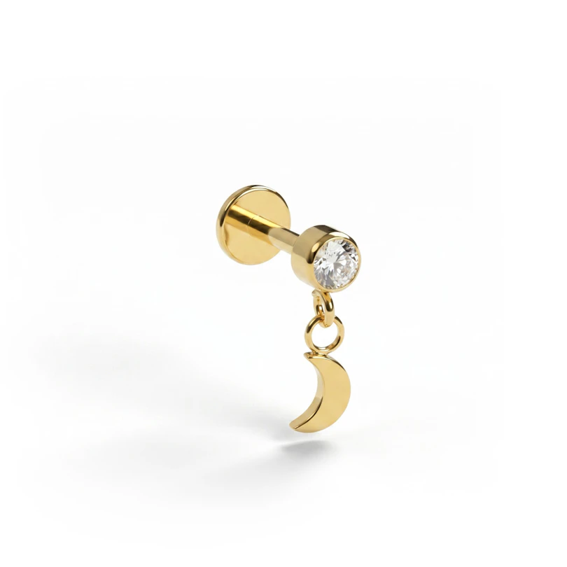 Denne titanlabreten med måneanheng er både enkel og stilig. Den har en sten i bezelfatning på toppen, med et lite måneformet anheng under. Anhenget gir labreten en stilig detalj, slik at den er like lett å bruke på egenhånd som i en stack. Finnes i gull- og sølvtone.