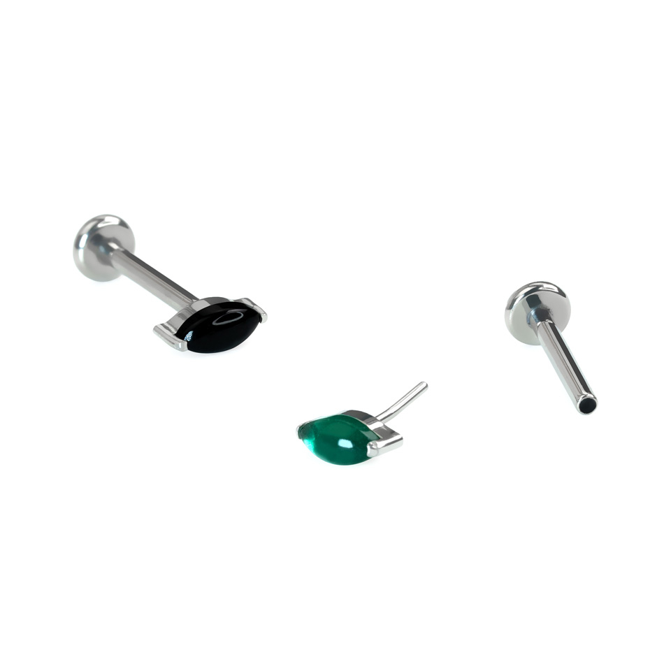 Denne labreten har en naturlig marquise-slipt onyx-sten som kommer i en svart eller grønn utgave. Stenen holdes på plass med delikate klør.