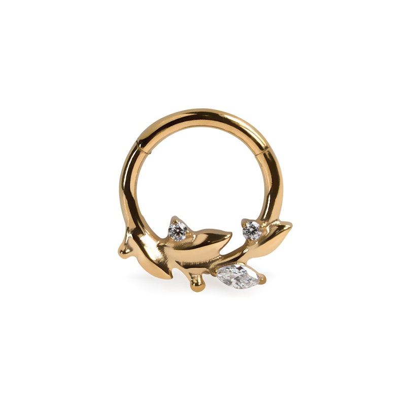 Denne vakre ringen med delikate blader er av titan, noe som gjør den ekstra egnet for sensitiv hud. Henglingsmekanismen gjør den enkel å feste i piercingen.