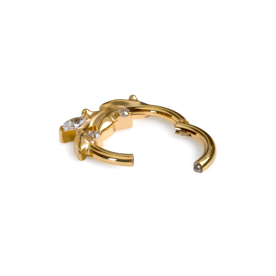 Denne vakre ringen med delikate blader er av titan, noe som gjør den ekstra egnet for sensitiv hud. Henglingsmekanismen gjør den enkel å feste i piercingen.