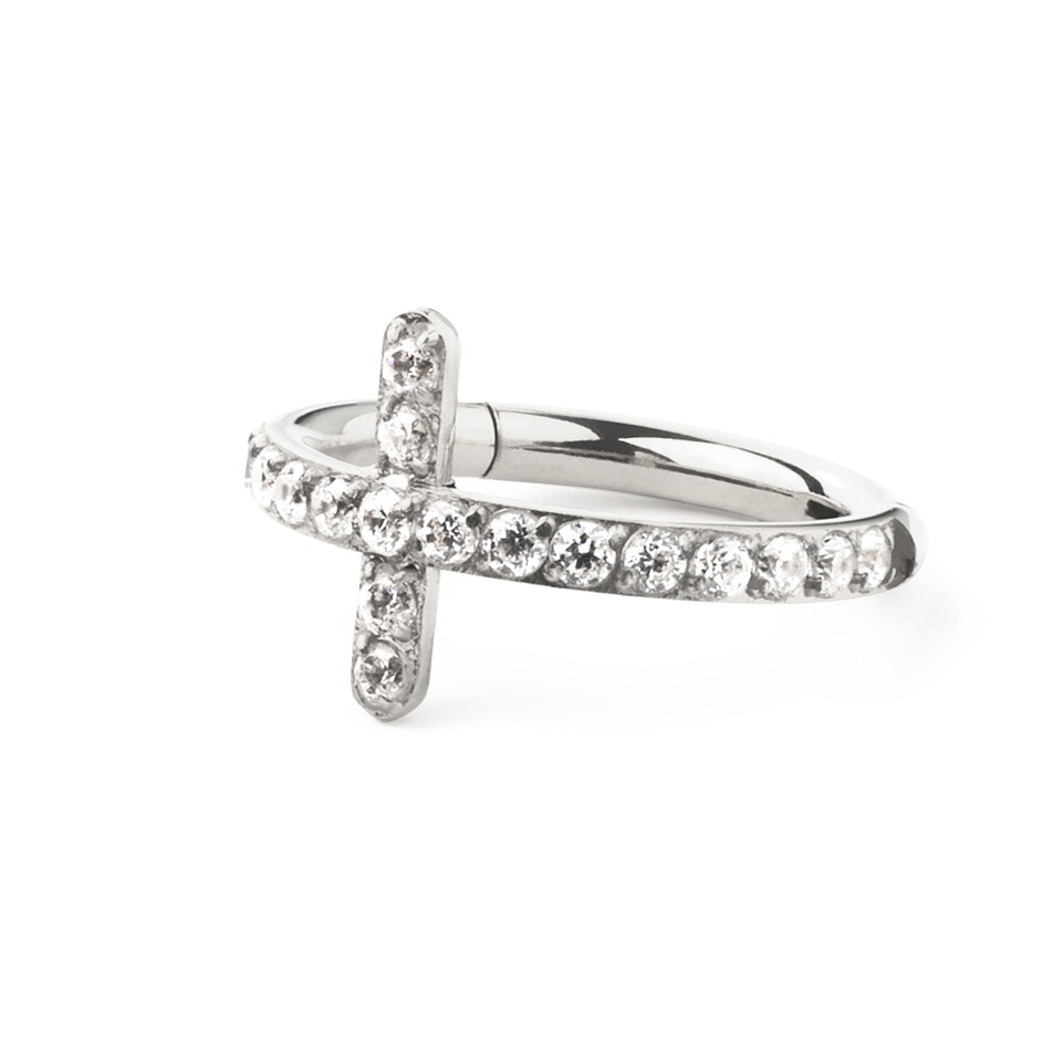 Forsiden av denne stilige titanringen danner et kors som er prydet med bittesmå edelstener. Med en hengslet feste er dette smykket enkelt å sette i piercingen. Titan er et hypoallergenisk og supert slitesterkt materiale, så smykkene dine vil bevare sin glans. Tilgjengelig i et utvalg av gull- og sølvfinisher, og en diameter på 8 mm eller 10 mm, kan dette allsidige smykket brukes i mange forskjellige piercinger, inkludert øreflippen, helix og tragus.