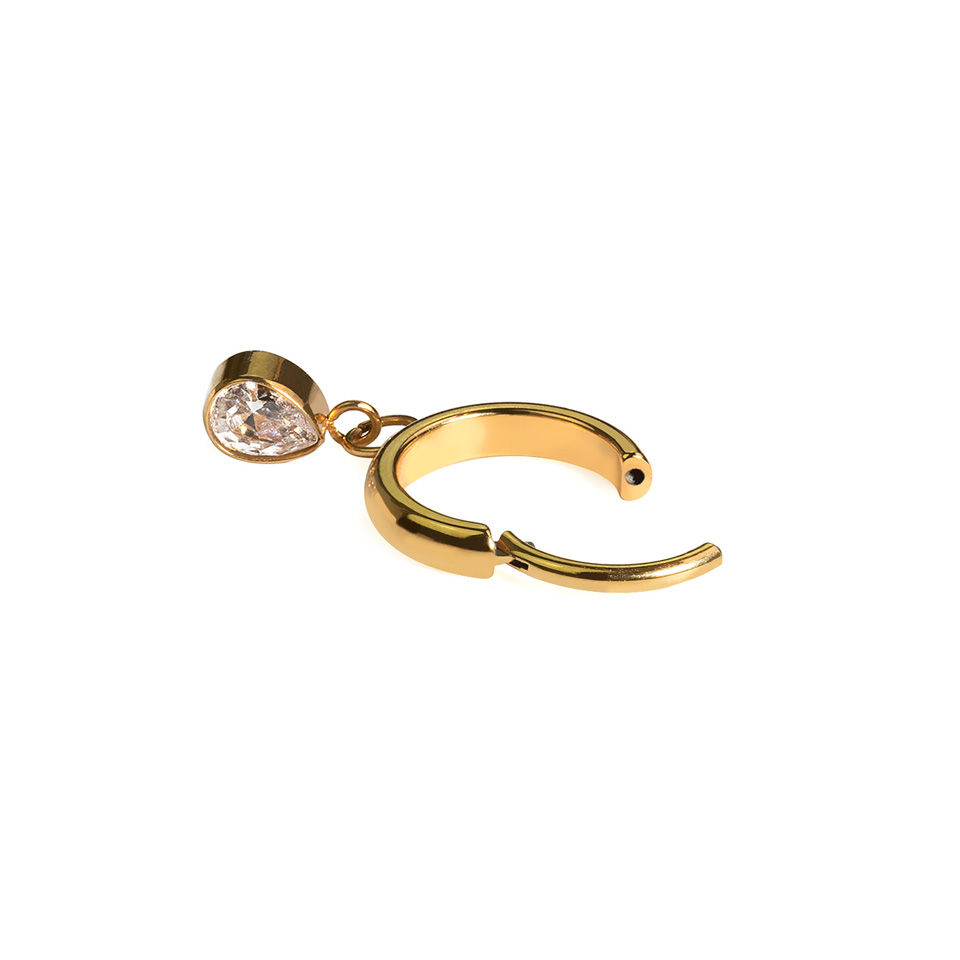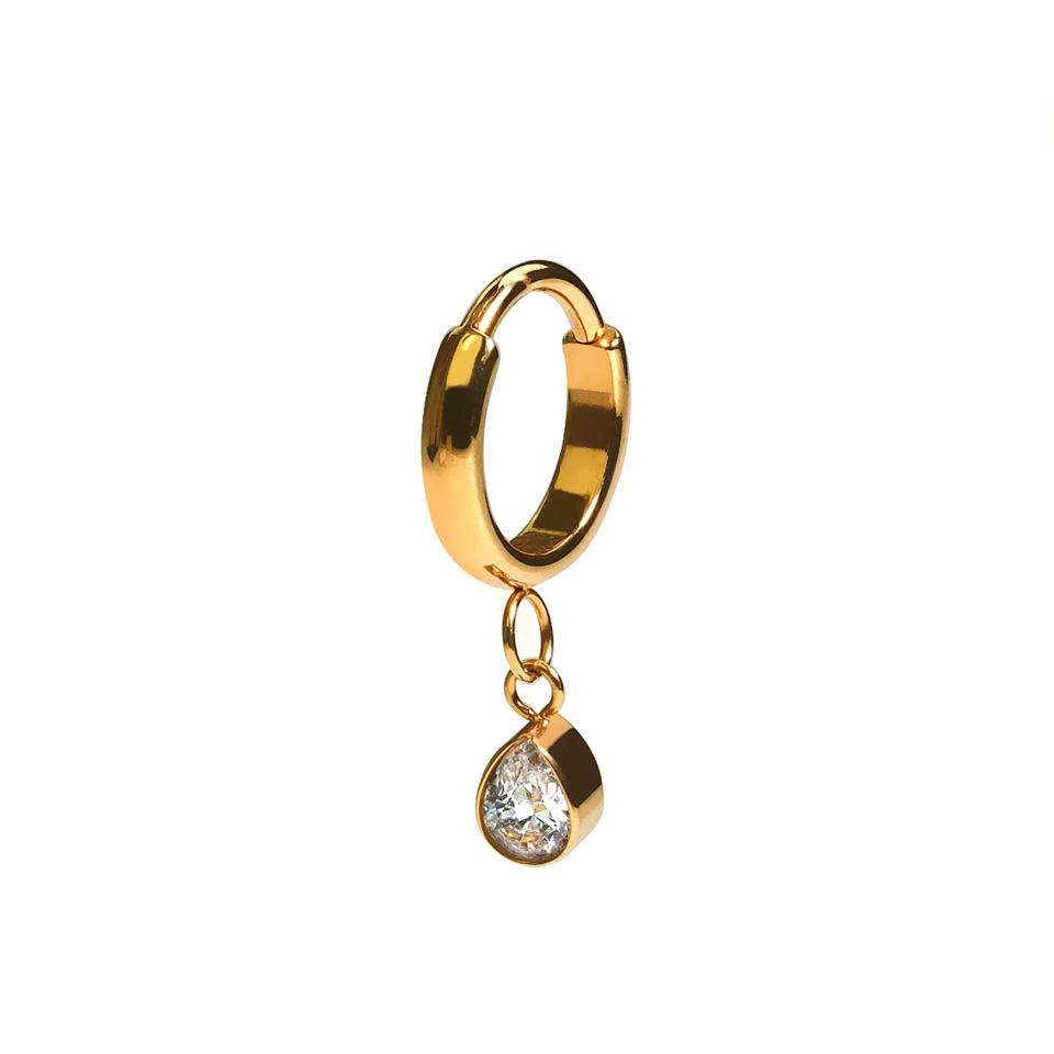 Den er utsmykket med en dråpeformet CZ-sten med bezelinnfatning festet til ringen med to delikate koblinger. Selve dråpen måler 4,5 mm. Ringen passer til en rekke piercinger inkludert øreflipp, helix og tragus.