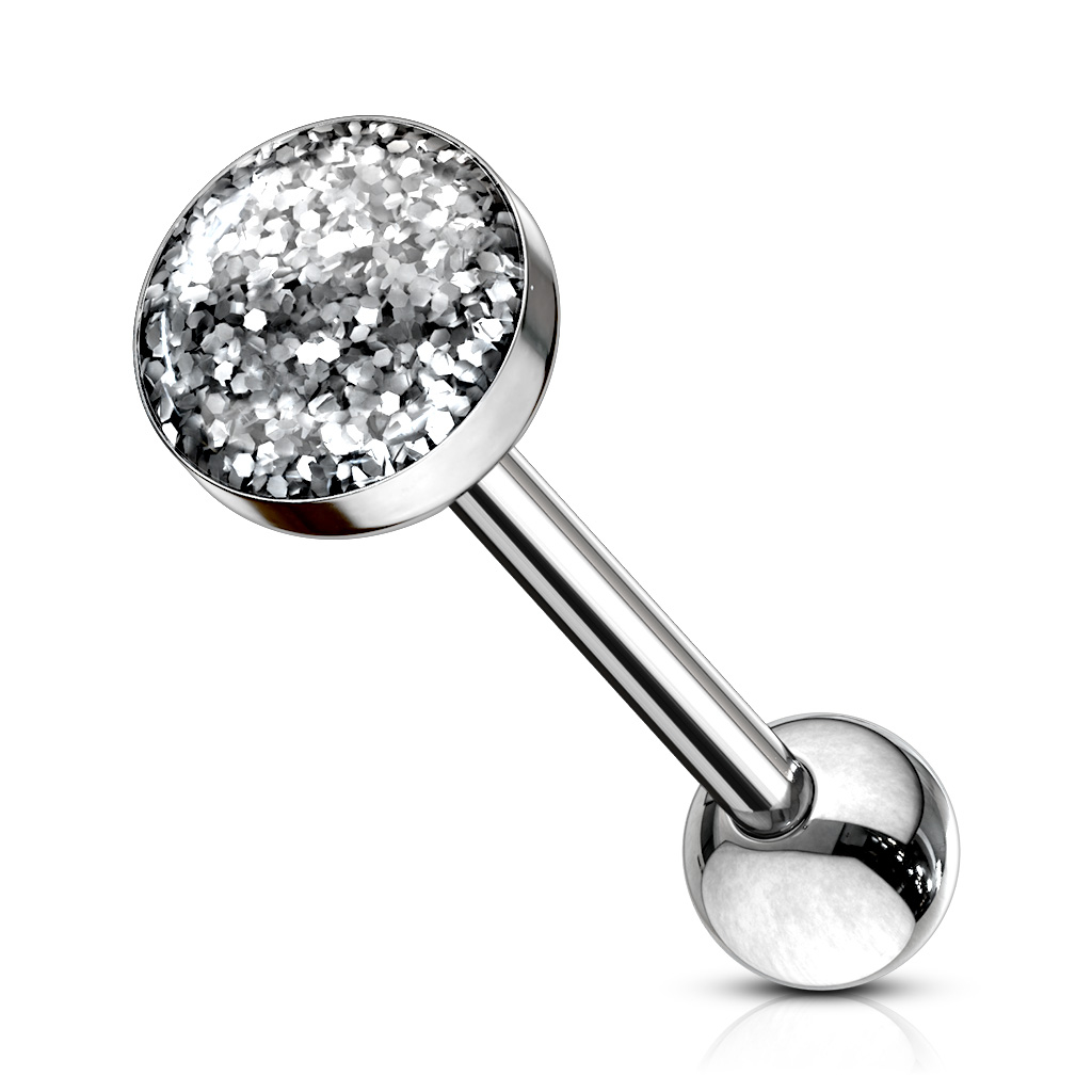 Det er hele 7 flotte klare farger å velge imellom, som består av en masse fargede glimmerflak, som er samlet under en kuppel av klar plast. Nettopp fordi det er snakk om glimmerflak, vil denne flotte tungepiercingen glitre og glimte når du snakker eller åpner munnen og lyset finner veien inn.