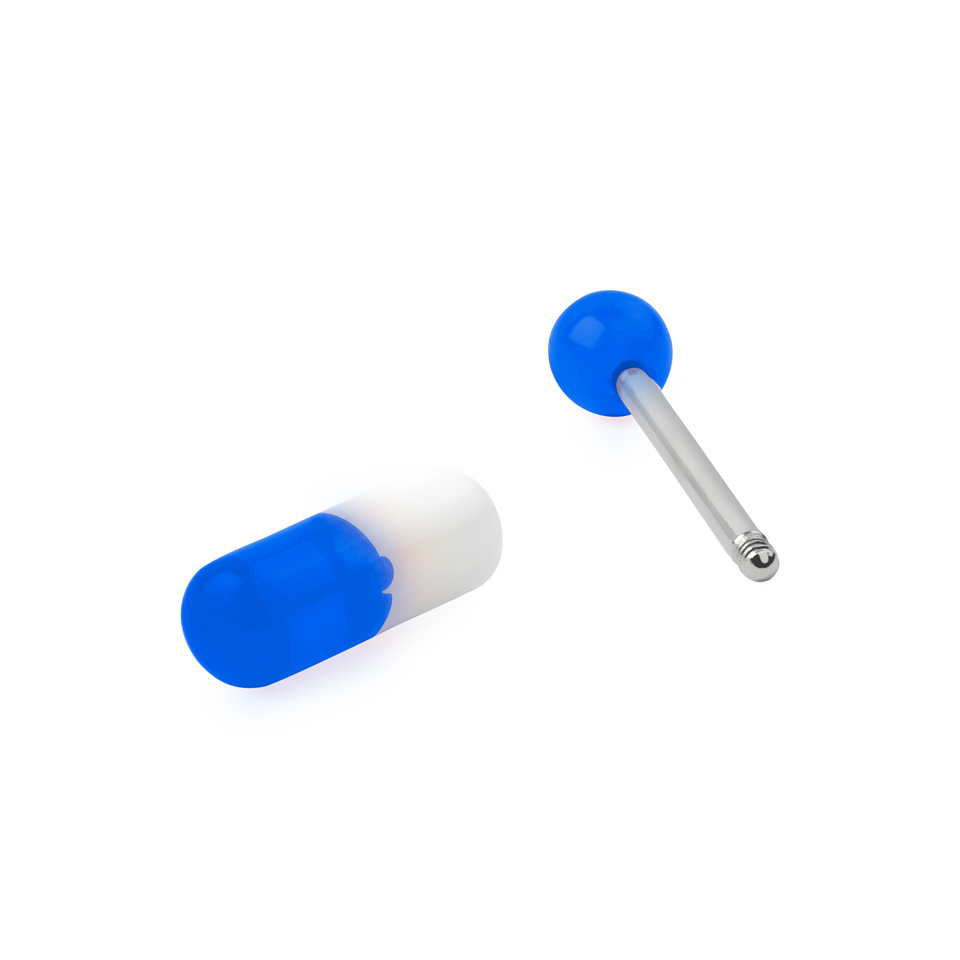 Staven på denne tungepiercingen er laget av kirurgisk stål mens bunnkulen og den frekke tofargede pillen er laget av akryl, som er et deilig skånsomt materiale å bruke i munnen. Akryl er et plastmateriale som utover å være nikkelfritt, også vil skåne dine tenner samt tannkjøtt mest muligt under bruk.
