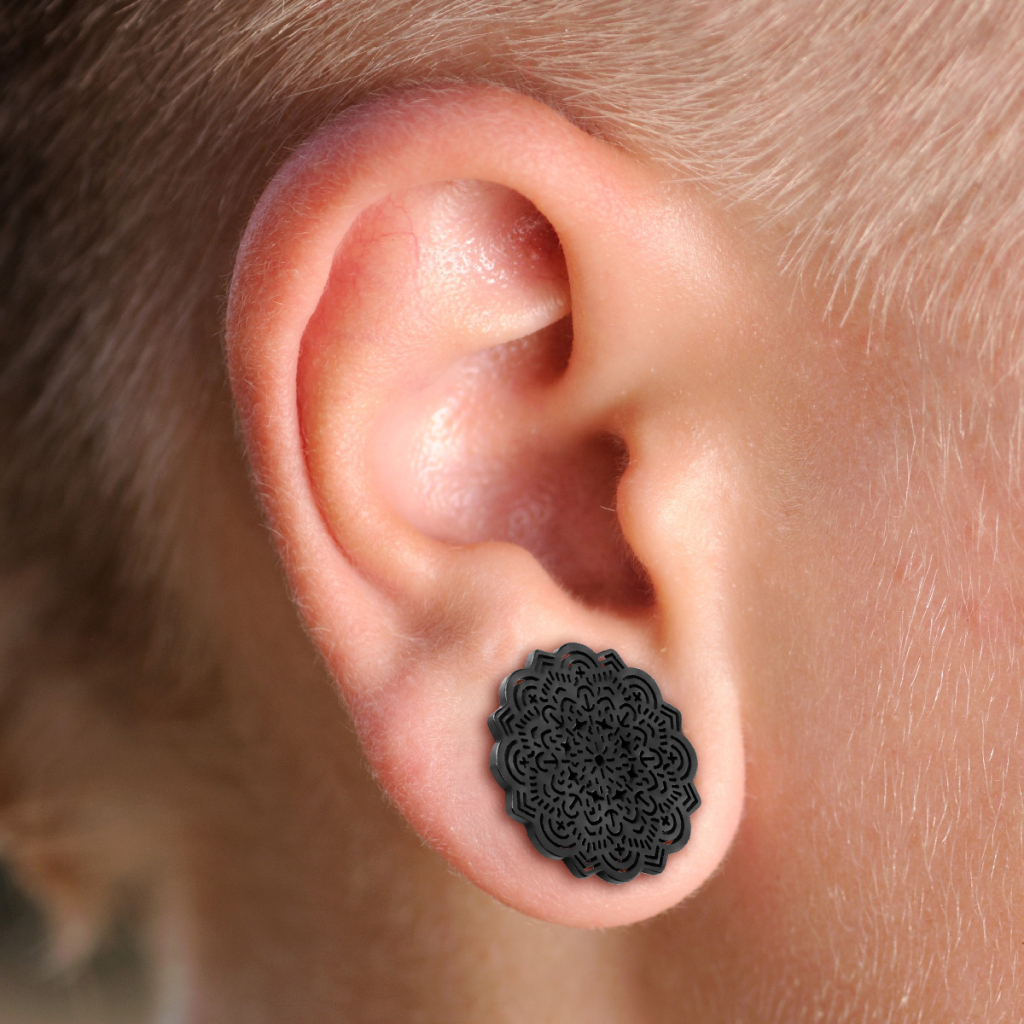 Her får du den flotte og ytterst detaljerte mandala i en flott farge, som tilføyer en ekstra spiss til det ellers søte og elegante designet. Når smykket sitter i øret, vil mandalaen være det eneste som kan ses fra forsiden. Bakpå er smykket laget av kirurgisk stål, og her kan baksiden skrus av for lettere innførsel i øret.