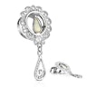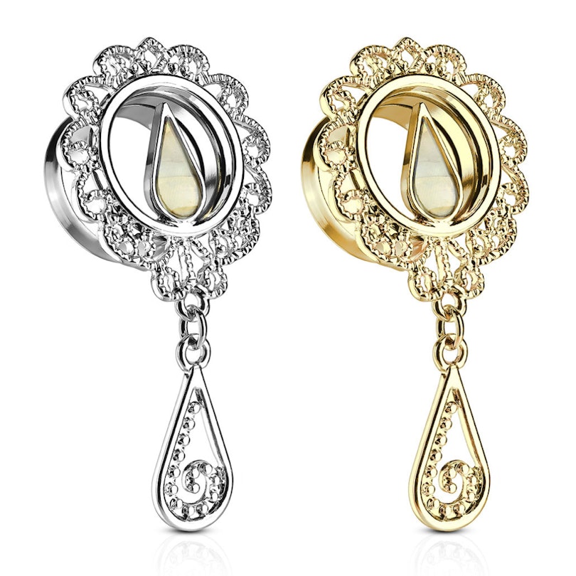 Det er faktisk to dråper på dette smykket - en som henger fritt under tunnelen i en liten ring og den som sitter fast i tunnelen, som også er den som har perlemorinnlegg. Rundt tunnelen er en krans av små sære armer, som til sammen danner et pent filigranmønster.