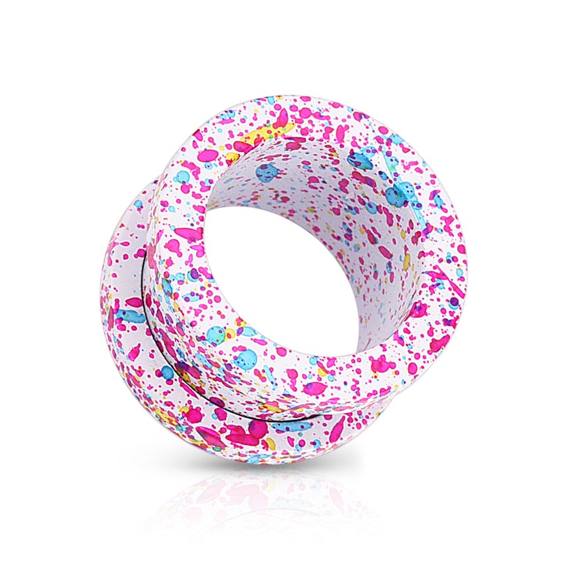 Her er den helt rette tunnel til deg som elsker sprell og farger i dine stretching smykker. Denne fete tunnel er laget av kirugisk stål og fås i mange forskjellige størrelser og farger, alt fra 3 mm. i diameter og helt opp til 16 mm. Den flotte tunnelen er designet så det ser ut som om en malerpensel med allverdens farger er ristet over smykket. De flotte splash flekkene er holdt i farger som alle komplimenterer hverandre godt rent fargemessig.
